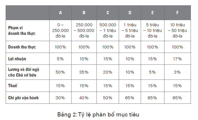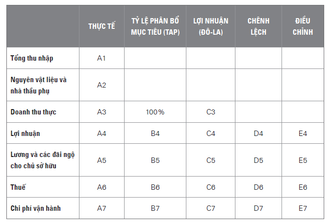 TAP (Tỷ lệ phân bổ mục tiêu): Tỷ lệ doanh thu lý tưởng mà bạn nên nhắm tới để phân bổ cho Lợi nhuận, Thuế, Lương và đãi ngộ cho chủ sở hữu và Chi phí vận hành. Bạn sẽ dần dần tăng CAP để đạt tới TAP Lợi nhuận, Thuế và Lương và đãi ngộ cho chủ sở hữu. Và dần dần giảm CAP Chi phí vận hành của bạn.