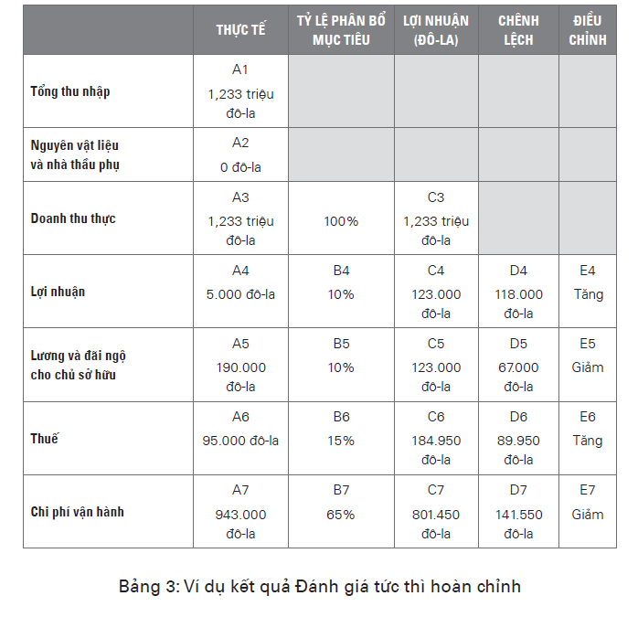 Doanh thu thực: Khi thực hiện Đánh giá tức thì, chúng ta sử dụng Doanh thu thực để thay thế cho lợi nhuận gộp. Trong trường hợp sử dụng nhiều nhà thầu phụ và/hoặc nguyên vật liệu thì các chi phí đó sẽ được trừ đi từ thu nhập để tính được doanh thu thực mà công ty tạo ra. Tính toán đến lợi nhuận gộp trong kế toán truyền thống có thể khác nhau dựa trên các cách giải thích khác nhau. Mục đích của Doanh thu thực là đơn giản hóa các sai lệch tính toán.
