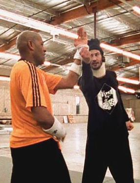 Keanu đeo nẹp cổ trong buổi huấn luyện cho phim The Matrix